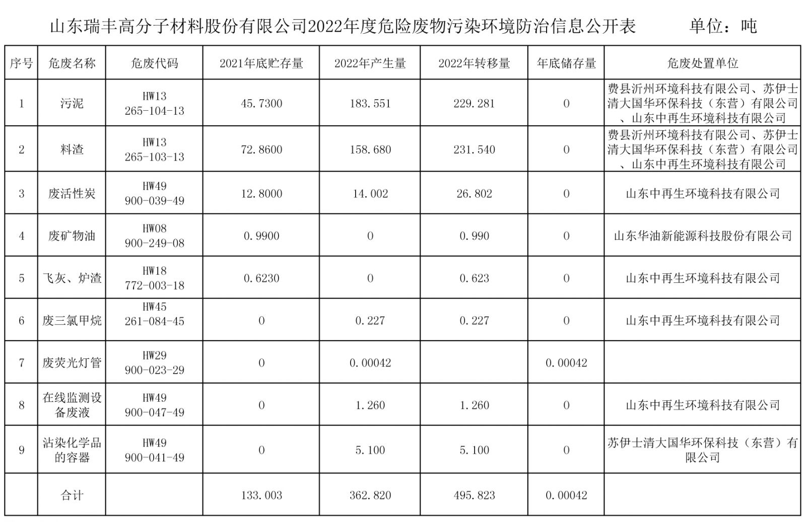 2022年度危險廢物污染環(huán)境防治信息公開表